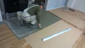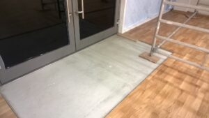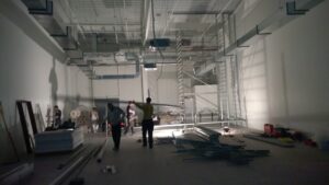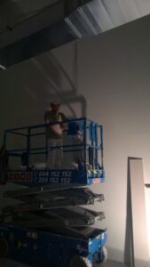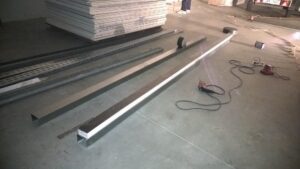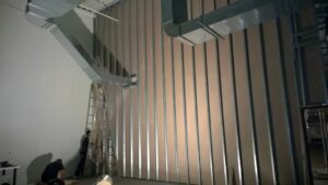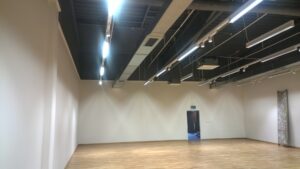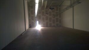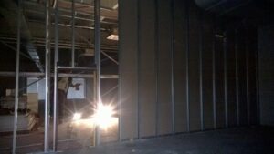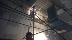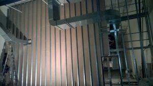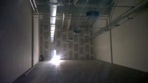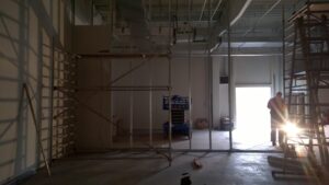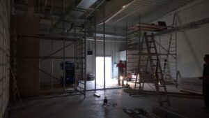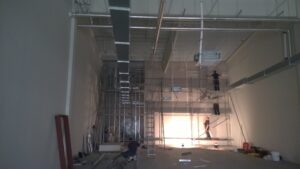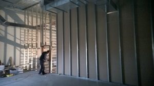Suchá výstavba – FAOC, zhotovení sádrokartonových vysokých příček W112 opláštěné 2x sádrokartonovou deskou Knauf White 12,5 mm, příčka ze sádrokartonu vysoká 7,5 a 6,5 metru včetně kluzkého napojení k stropní konstrukci, profil UV MAX, pokládka dlažky, provedení kabeláže ve stávajících protipožárních příčkách ze sádrokartonu dle technologie Knauf, oprava diletací v oplaštění Protipožární akrylový tmel Hilti, CFS-S ACR, drážkování drážkovacím strojem Hilti DC-SE 20, vystěrkování vysprávkovou hmotou WEBER a olištování čisticí zóny, seštelování dveří.