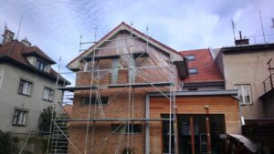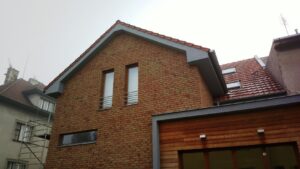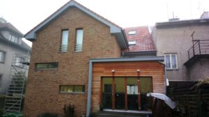 RD Nymburk – atika a podbití rodinného domu z OSB desek, penetrováno kontaktním můstkem Weber.haft rapid, weber.therm klasik – lepicí a stěrkový tmel, výstužná Weber.therm 117 skleněná síťovina, Weber.pas silikon plus – zrnitý 1 mm Jednoduše zpracovatelná, probarvená, pastovitá, tenkovrstvá omítka obsahující silikonové pojivo, připravena k přímému použití se systémovou penetrací Weber.pas podklad S.