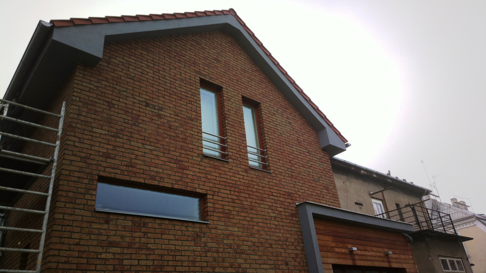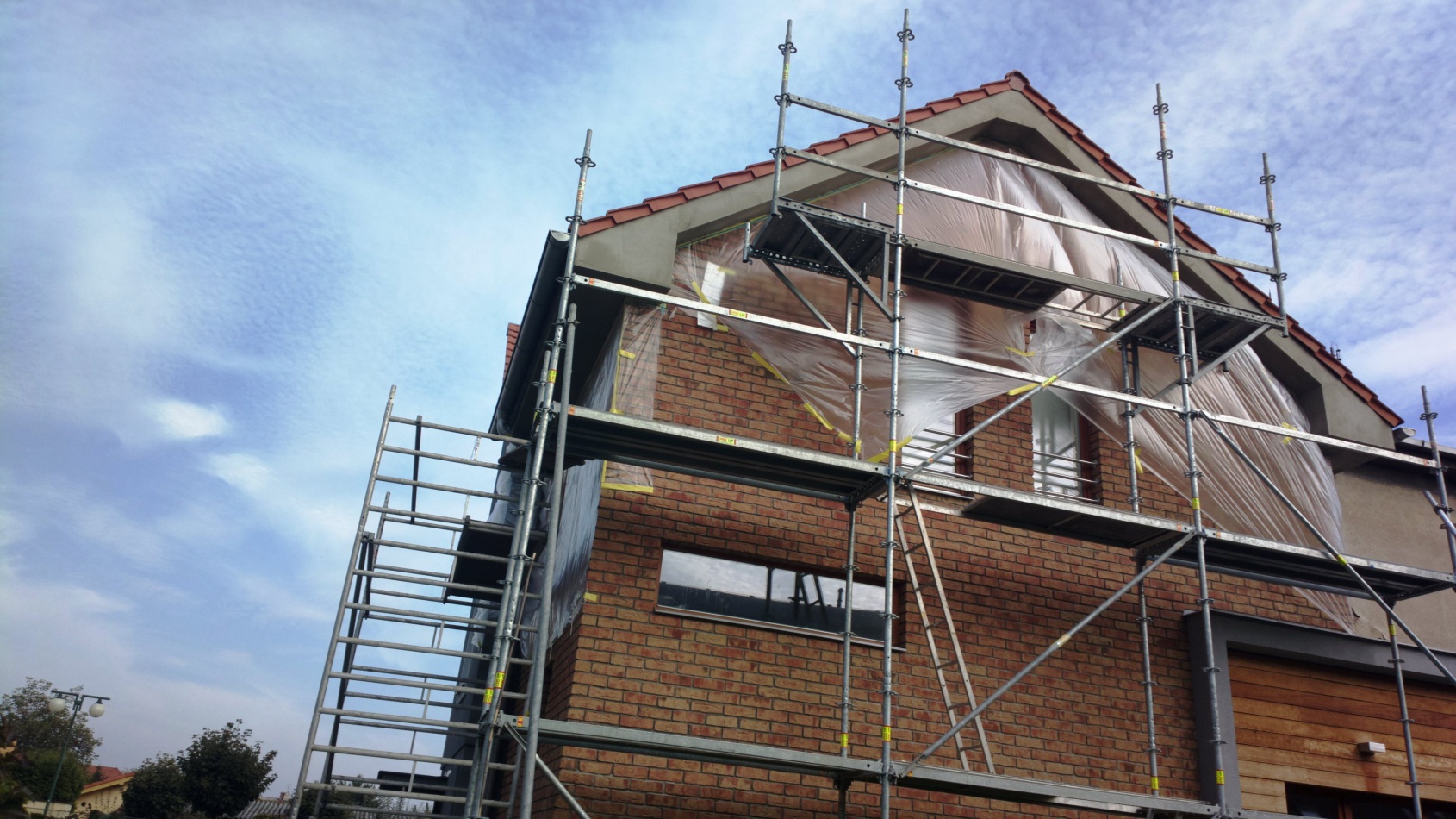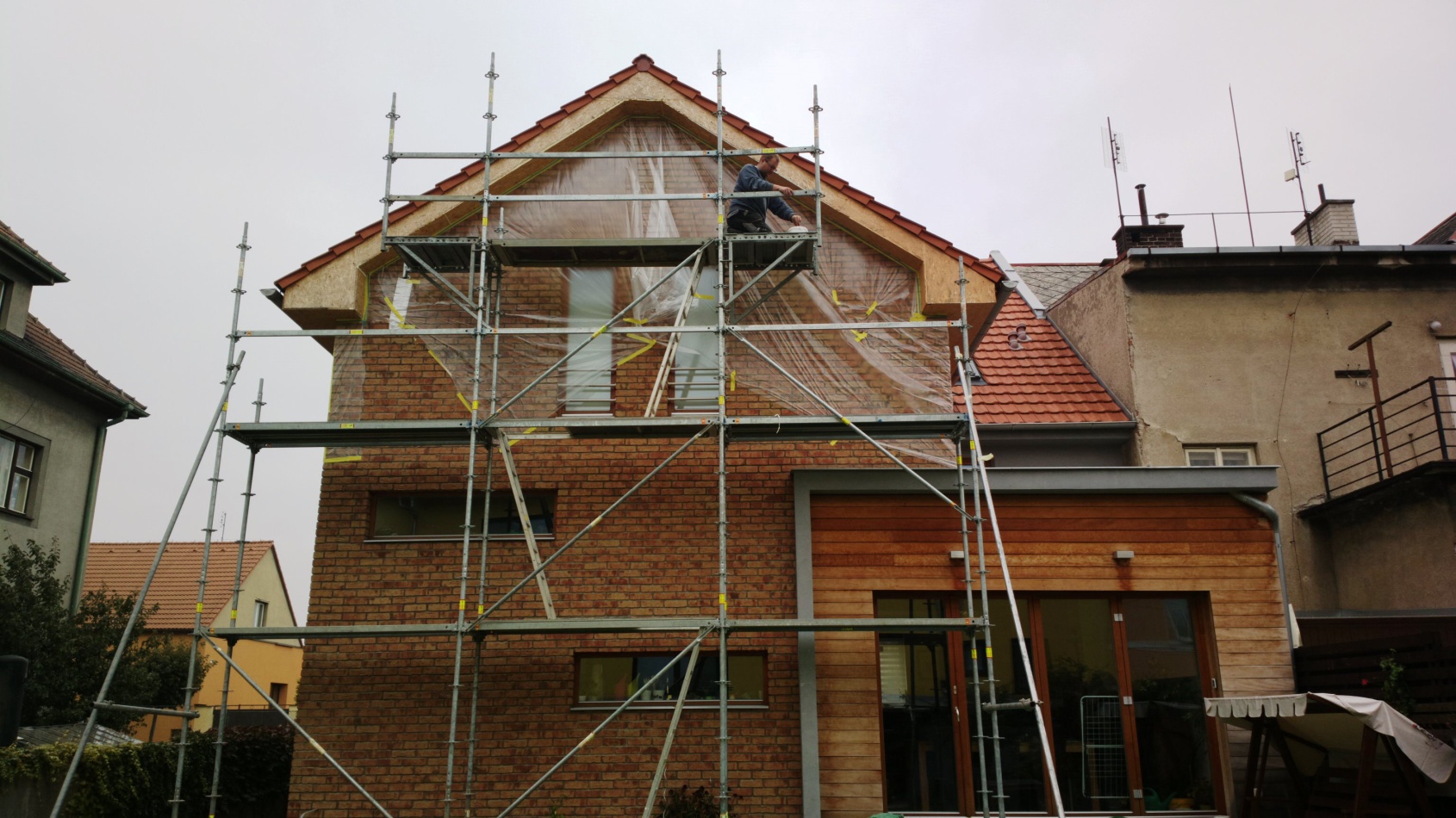 RD Nymburk – atika a podbití rodinného domu z OSB desek, penetrováno kontaktním můstkem Weber.haft rapid, weber.therm klasik – lepicí a stěrkový tmel, výstužná Weber.therm 117 skleněná síťovina, Weber.pas silikon plus – zrnitý 1 mm Jednoduše zpracovatelná, probarvená, pastovitá, tenkovrstvá omítka obsahující silikonové pojivo, připravena k přímému použití se systémovou penetrací Weber.pas podklad S.