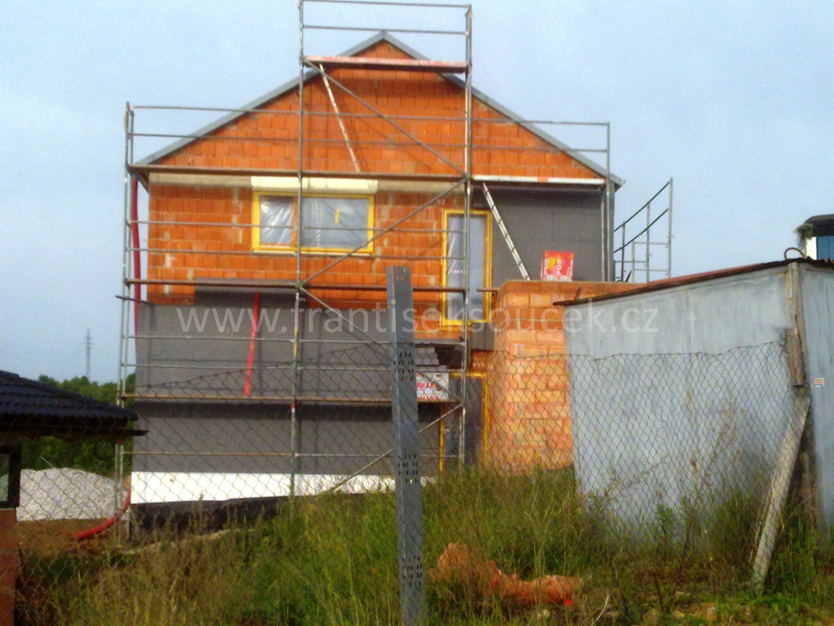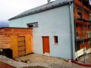 Zateplení fasády rodinný dům Loděnice, okres Beroun – střední Čechy. Fasádní polystyren 120 mm. Bachl Extrapor, zakládací lišta, talířové hmoždinky, polystyrénová zátka, silikonová omítka Weber 1,5 mm (točená) 220 m2.
