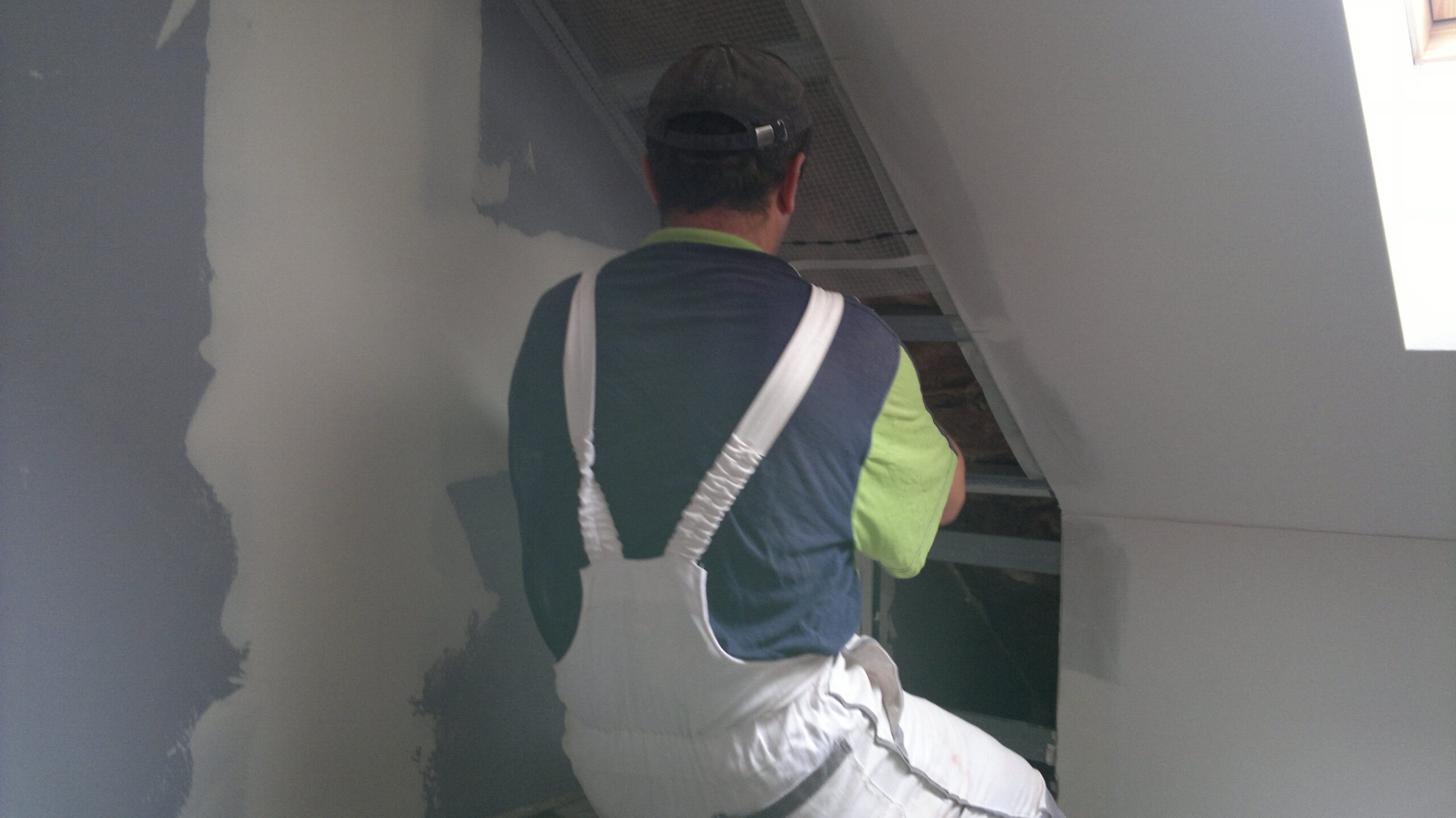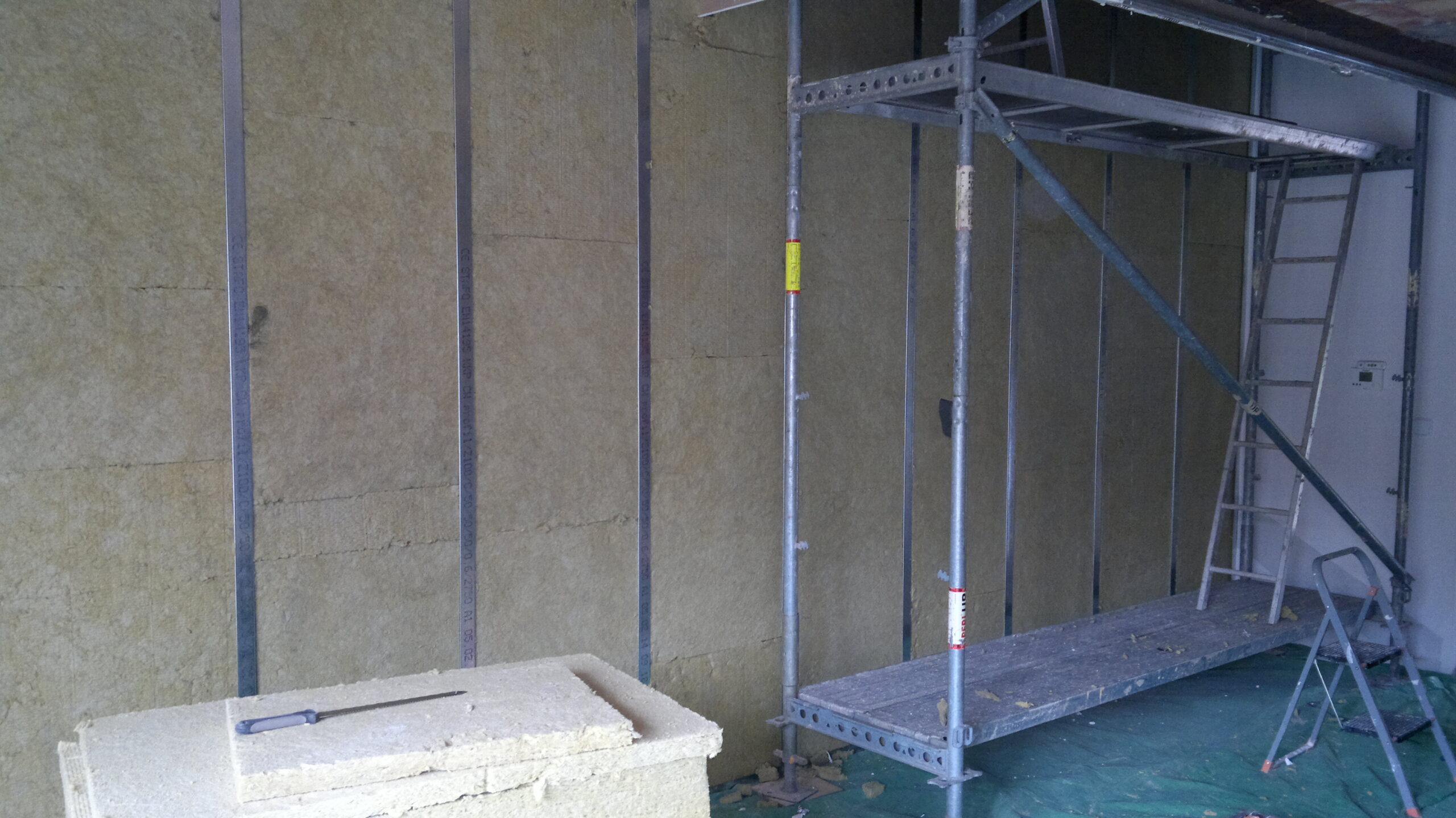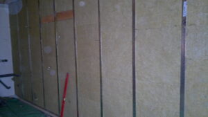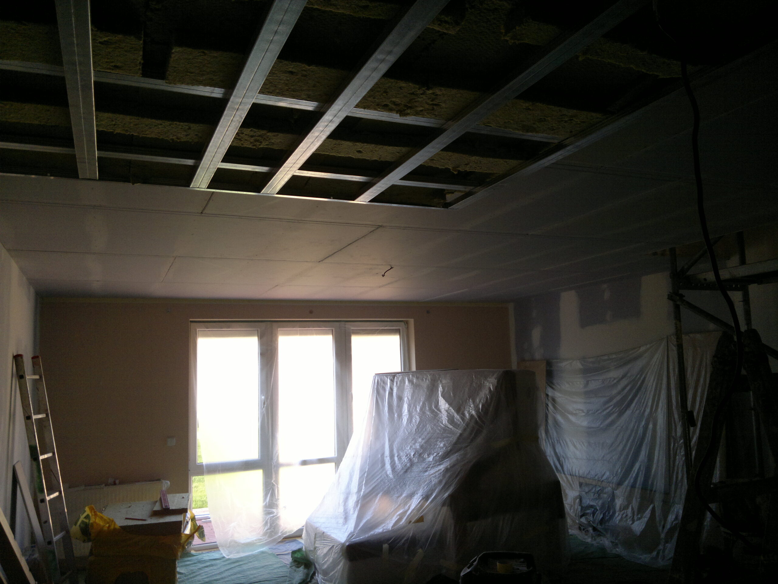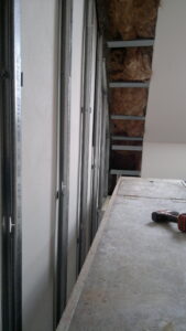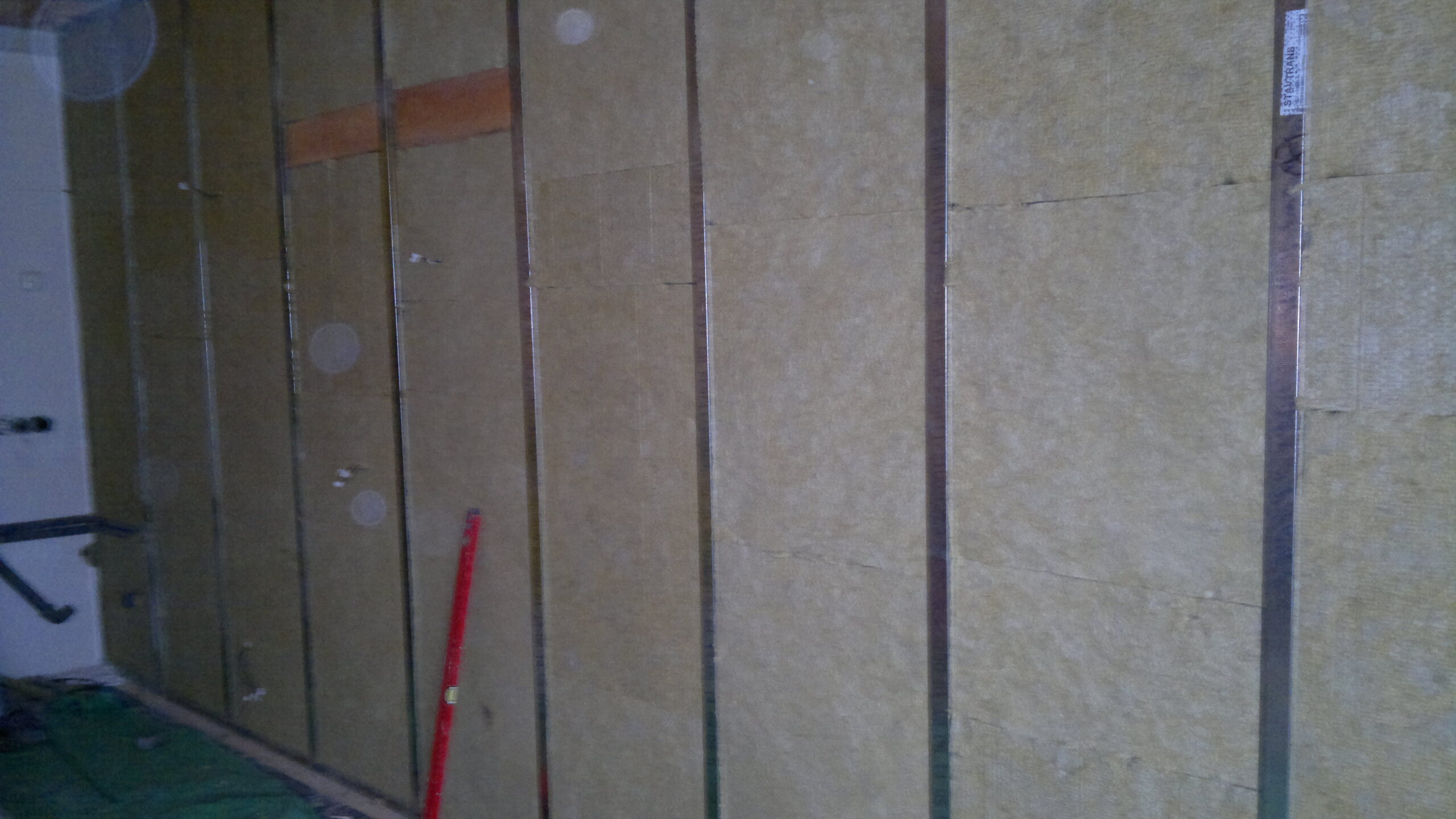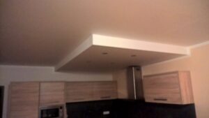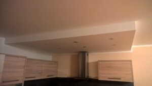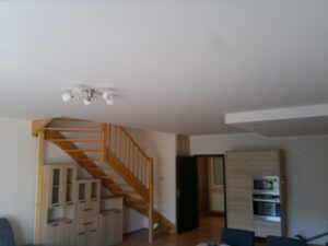 Suchá výstavba – akustický sádrokarton Modré ticho II a III etapa Rodinný dům Říčany, akustická předsazená stěna Rigips – úprava nedostatečné akustiky obvodové stěny řádového rodinného domu, rozebrání podkroví, vložení dodatečné izolace do stropní dutiny, úprava elektroinstalace předsazená stěna volně stojící akustická na CW a UW profilech 100 mm, vložená minerální izolace MPE 80 mm, zlepšení zvukové neprůzvučnosti až Rw o 28 dB., akustický podhled Rigips strop D112 zvuková neprozvučnost Rw 60db REI 30 minut, sádrokartonový ostrůvek v kuchyni, montáž a dodání LED bodového osvětlení Kanlux, výmalba.