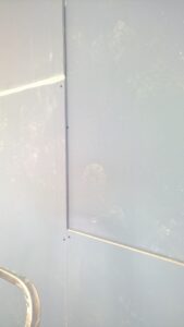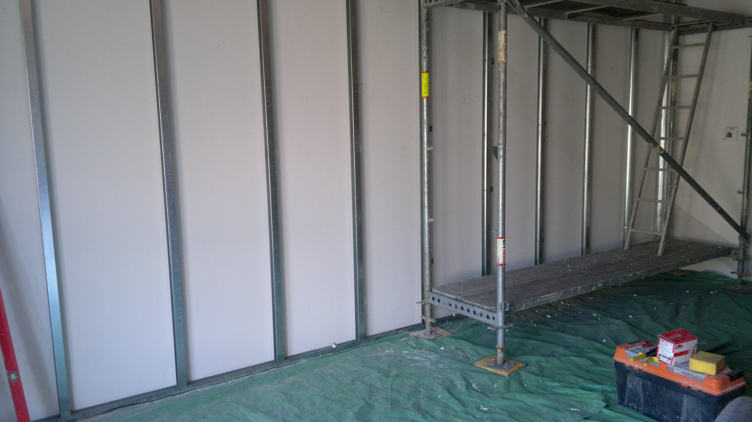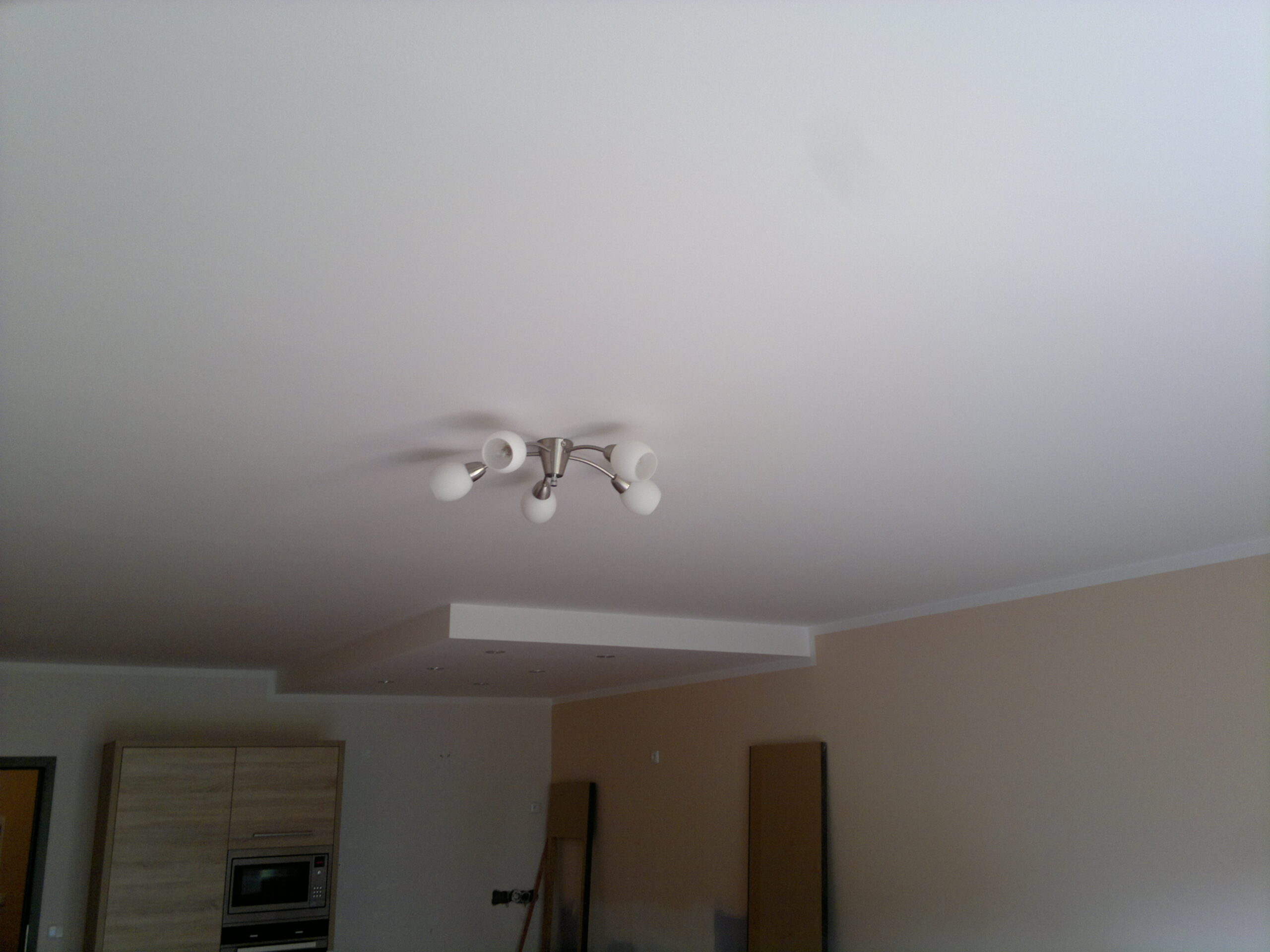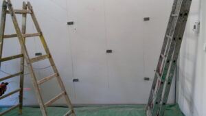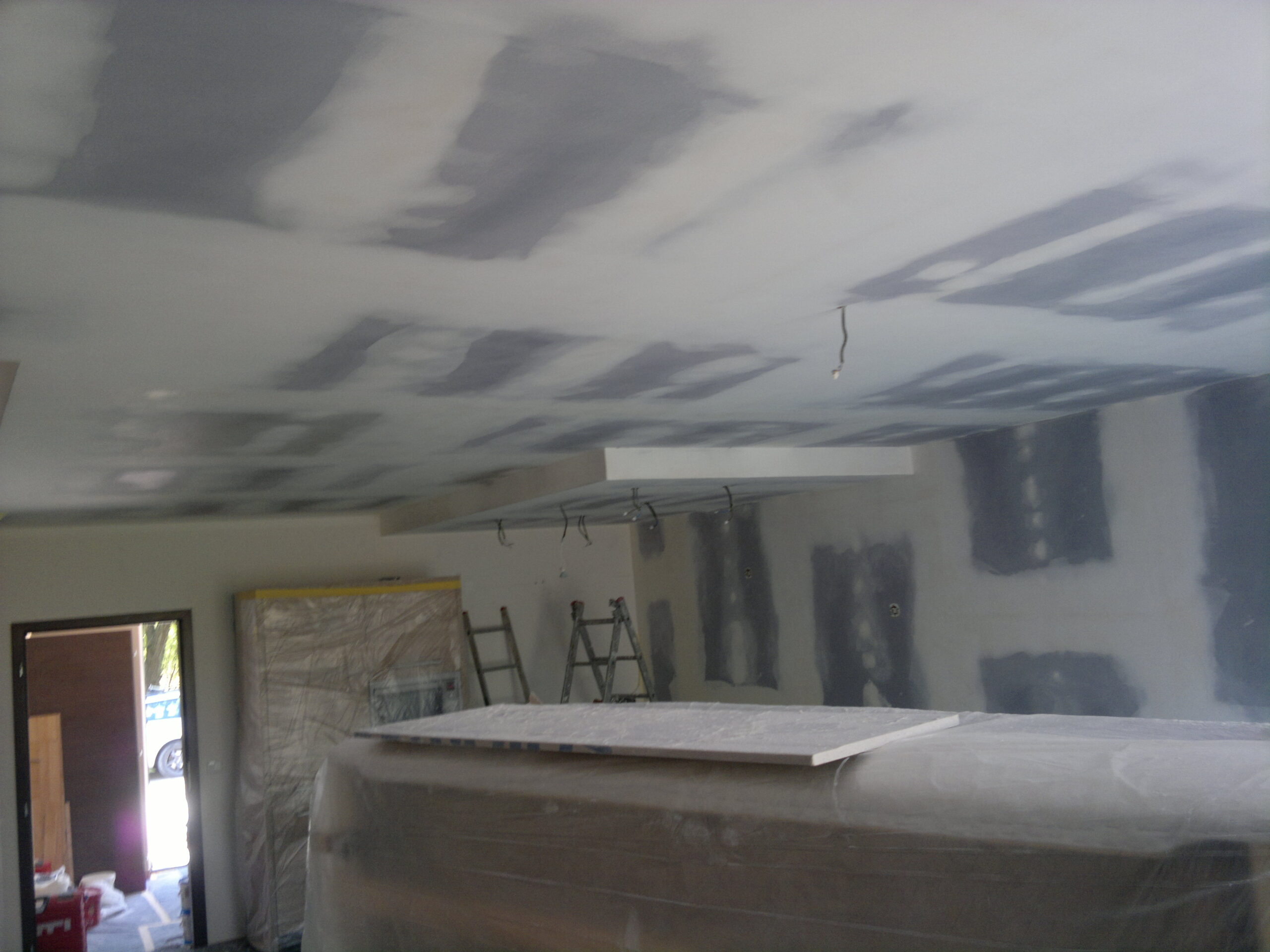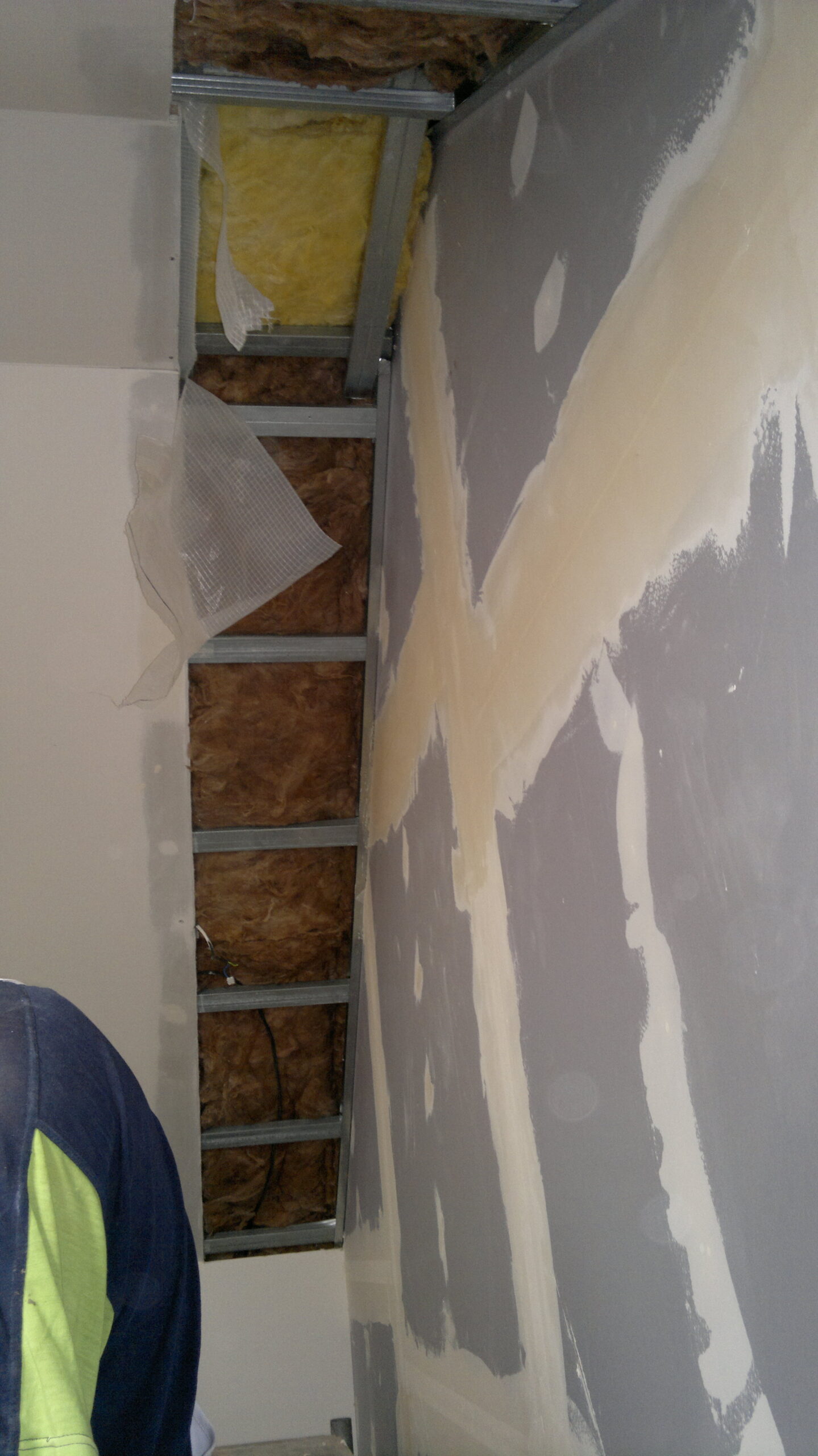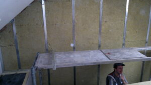 Suchá výstavba – akustický sádrokarton Modré ticho II a III etapa Rodinný dům Říčany, akustická předsazená stěna Rigips – úprava nedostatečné akustiky obvodové stěny řádového rodinného domu, rozebrání podkroví, vložení dodatečné izolace do stropní dutiny, úprava elektroinstalace předsazená stěna volně stojící akustická na CW a UW profilech 100 mm, vložená minerální izolace MPE 80 mm, zlepšení zvukové neprůzvučnosti až Rw o 28 dB., akustický podhled Rigips strop D112 zvuková neprozvučnost Rw 60db REI 30 minut, sádrokartonový ostrůvek v kuchyni, montáž a dodání LED bodového osvětlení Kanlux, výmalba.